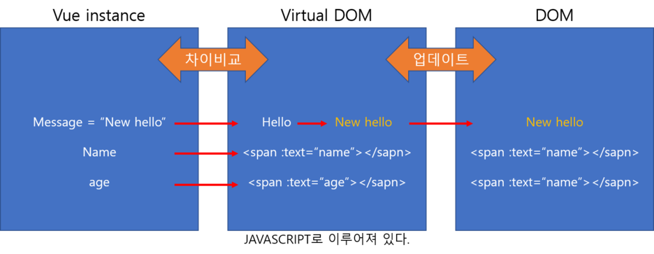 위의 그림에서 볼 수 있듯이 vue는(리액트, 앵귤러 동일) 가상 돔을 통해 화면의 변화를 반영하고 실제 DOM에 변경사항을 한 번에 반영한다.