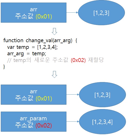 - arr_arg에 temp의 주소 값이 재할당 되는 순간 arr과 arr_arg는 서로 다른 값을 바라보는 주소 값을 가지게 됩니다.