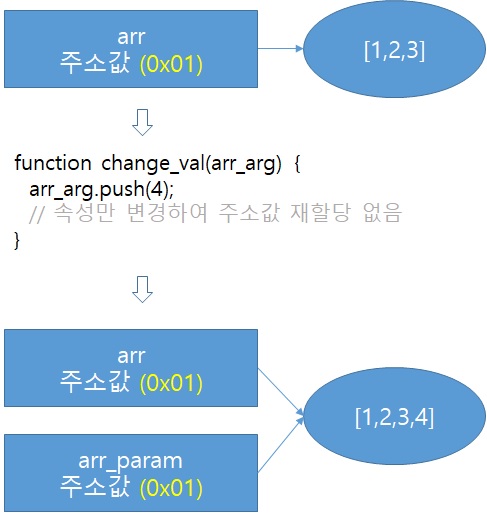 - 주소 값이 재할당 되지 않았고 push를 통해 속성만 추가했기 때문에 원본 데이터에도 push 된 4가 들어가 있습니다.