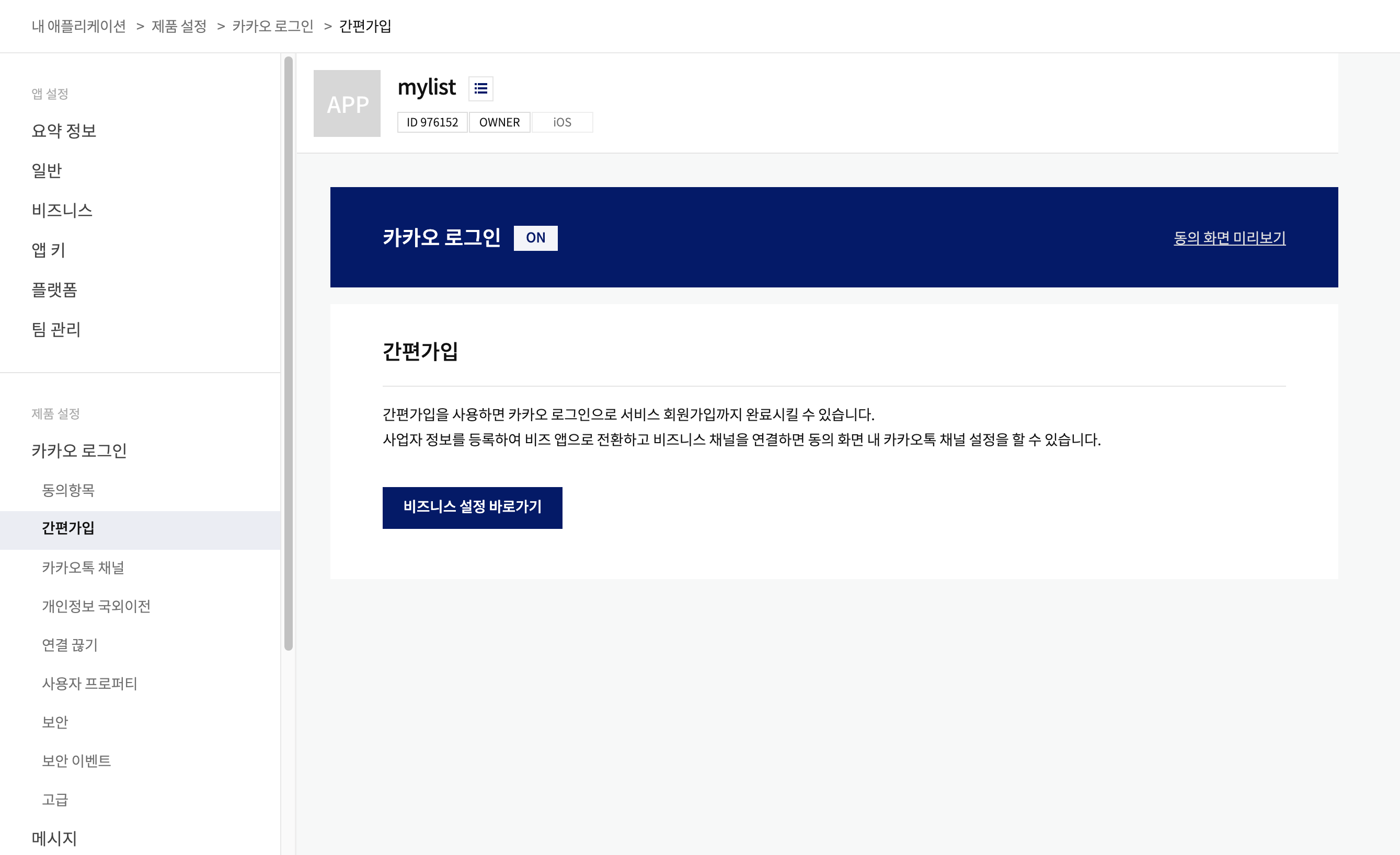 2. 카카오 디벨로퍼 간편가입 메뉴에서 ON으로 되어 있는지 확인하기